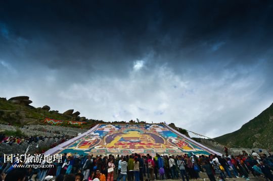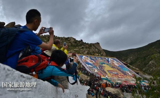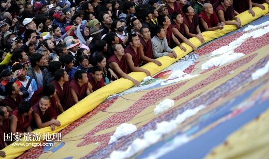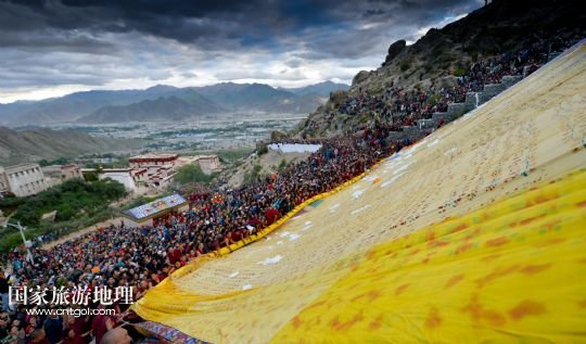 國(guó)家旅游地理 西藏拉薩8月6日訊 8月6日,拉薩哲蚌寺舉行展佛儀式。當(dāng)日,以西藏最大的格魯派寺廟哲蚌寺展佛為開(kāi)端的雪頓節(jié)在拉薩拉開(kāi)序幕。每年藏歷六月底七月初是西藏傳統(tǒng)的節(jié)日“雪頓節(jié)”。在藏語(yǔ)中,“雪”是酸奶子的意思,“頓”是“吃”“宴”的意思,“雪頓節(jié)”按藏語(yǔ)解釋就是吃酸奶子的節(jié)日,因此又叫“酸奶節(jié)”。因?yàn)?ldquo;雪頓節(jié)”期間有隆重?zé)崃业牟貞蜓莩龊鸵?guī)模盛大的曬佛儀式,所以有人也稱(chēng)之為“藏戲節(jié)”“曬佛節(jié)”。 /新華社記者 普布扎西攝