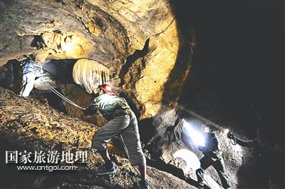 離開(kāi)前洞,順路蜿蜒3公里至后洞,洞口依舊狹小,僅能1人由吊繩垂入約2米著地,斜向下行約5米,石鐘乳洞豁然開(kāi)朗,約500米見(jiàn)方,地面較為平坦,前壁有一紅色“龍形”圖案,頭頂石壁還有一匐匍向前的倒掛石龜,其旁掛著一串“葡萄”狀鐘乳石……