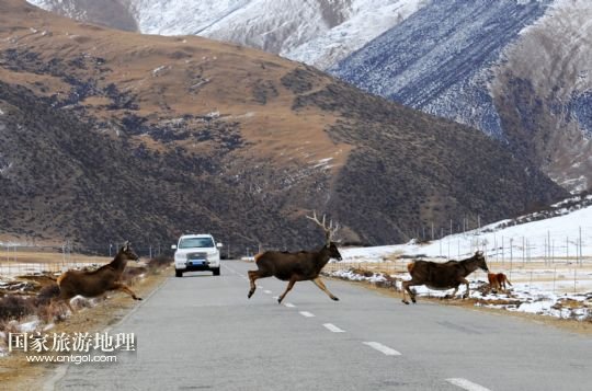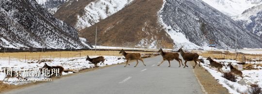 國家旅游地理 西藏拉薩11月3日訊 11月2日,在西藏工布江達縣境內,一群白唇鹿在通過公路。白唇鹿是我國特有的珍稀物種,為國家一級重點保護動物,分布在青海、甘肅及四川西部、西藏東部。 /新華社記者文濤攝