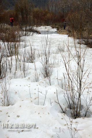 內(nèi)蒙古阿爾山市白狼林區(qū)陸續(xù)消融的河谷冰雪(5月14日攝)。