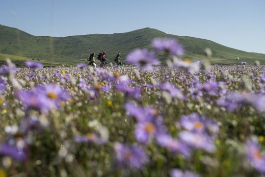 國(guó)家旅游地理四川阿壩州6月19日訊 6月19日拍攝的晨曦下的俄木塘草原花海。目前,四川省紅原縣壤口鄉(xiāng)俄木塘草原花海進(jìn)入鮮花盛開(kāi)期。俄木塘草原花海位于四川省紅原縣壤口鄉(xiāng)長(zhǎng)江黃河分水嶺之山麓,海拔3500米。每年6月到7月,方圓3平方公里的草原上各種顏色的野花盛開(kāi),令游客心馳神往,被譽(yù)為“最美的草原花海”。 /新華社記者 江宏景攝