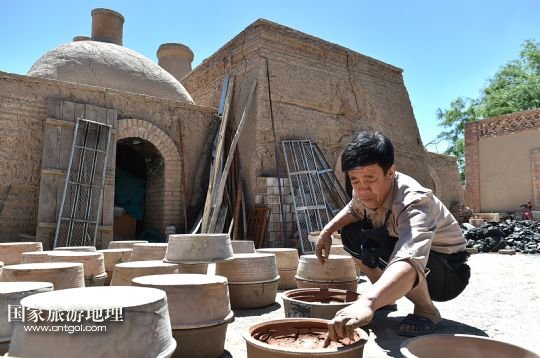 國家旅游地理 寧夏銀川6月12日訊 6月11日,李五奎在銀川西夏風(fēng)情園陶藝館制作陶罐。今年51歲的陶藝師李五奎和泥巴打了一輩子交道。從他爺爺開始,一家三代人都以制陶為生。李五奎從十幾歲開始便幫著家里制作陶器。